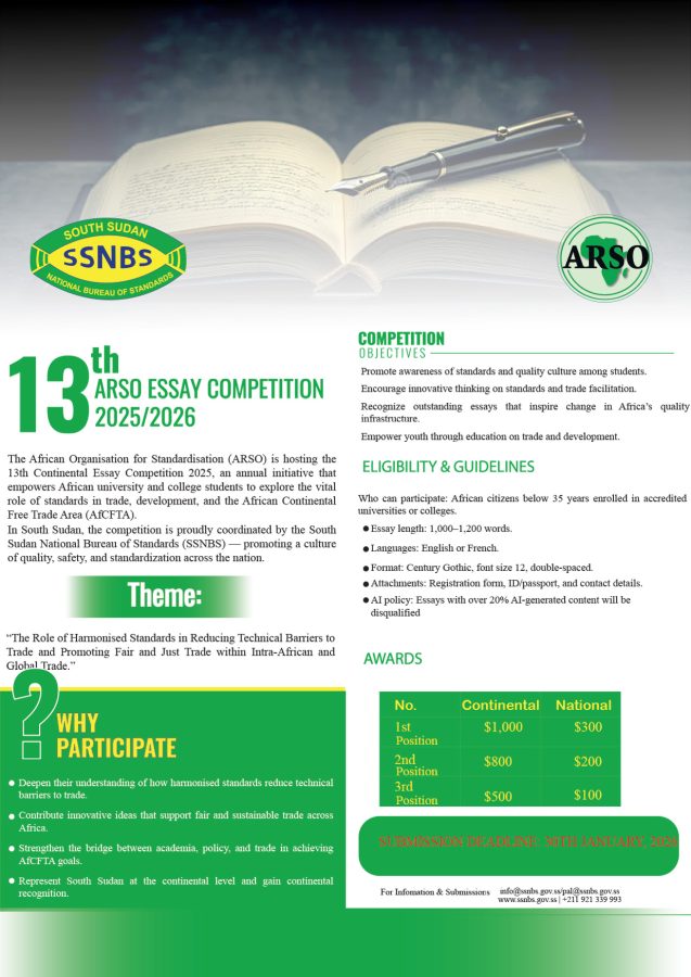 The South Sudan National Bureau of Standards (SSNBS) is pleased to announce the Call for Interest for the National ARSO Essay Competition 2025/2026 — an exciting opportunity exclusively for higher education students to showcase their ideas on continental trade, harmonized standards, and Africa’s economic transformation Theme: “The role of harmonised standards in reducing Technical Barriers to Trade and in promoting fair and just trade within the Intra-African and Global Trade.” This competition offers a platform for students and young professionals to contribute fresh perspectives toward Africa’s economic integration and global competitiveness. It is also a golden chance to represent South Sudan at regional and continental levels. For more information, please contact us at: 📧 info@ssnbs.gov.ss / pal@ssnbs.gov.ss